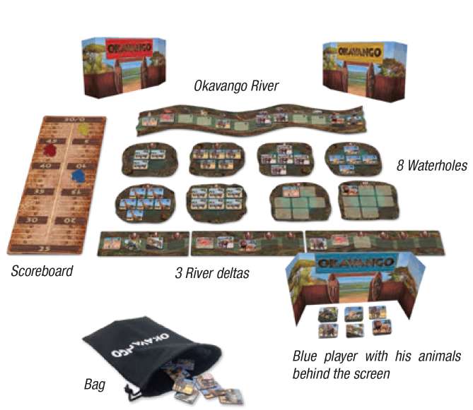 Place the Okavango River, the 8 waterholes and the scoreboard face-up on the table. Also position the 3 river deltas on the table, with the water side facing upwards.