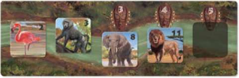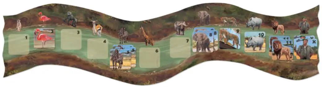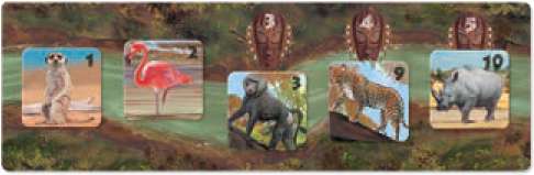 Finally, a further 13 cards are taken, unseen, from the bag and placed along the Okavango, on the squares with that animal's picture. This forms the visible stock.