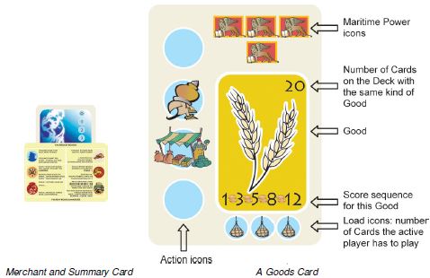 Each player starts from the Card on the top and continues drawing Cards from his Cargo Stack until Goods of the same kind are grouped together. A Card with a different kind of Good begins a new set.