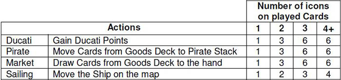 Each Card shows 2 of the 4 possible Actions: Ducati, Pirate, Market, Sailing. These Actions must be performed in the following order: