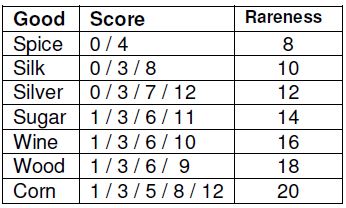 Each group of Cards is considered. There is a particular sequence of points for each Good (see the Table on the right or each Card). The numbers on the sequence indicates the number of Ducati Points gained if the group is formed by that number of Cards.