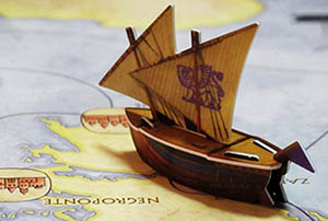 The map shows the Mediterranean sea and the Harbors. One wooden cube for each player represents the player's Ship. Every Ship moves along courses (dotted lines) and stops at Harbors.