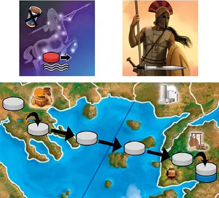 Example: White has the Astronomy discovery, enabling him to cross sea spaces at the cost of 1 action point, and the Hoplite discovery, which gives him one Sword. He decides to attack Blue, who has no Swords.