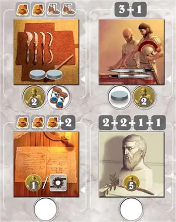 To develop Philosophy (bottom/right), the player must pay two pairs of resources and two other resources, all different. For example, 2 Grain, 2 Wood, 1 Gold and 1 Stone.