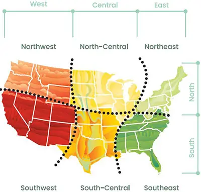 The 5 regions combine to form 6 individual areas: Northwest, North-Central, Northeast, Southwest, South-Central, and Southeast.