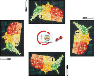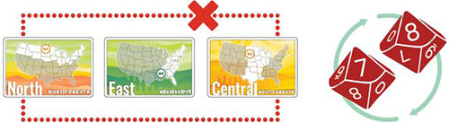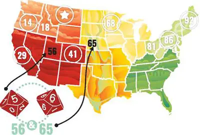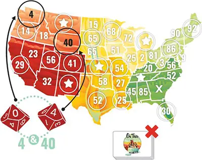 Combine the results to form two different 2-digit numbers (i.e. 1 & 4 combine to form 14 & 41). One player draws a card. All players write the lower dice combination on that state.