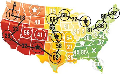 Score one point for each state you visit and an additional point for each encircled star or number on your route.