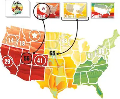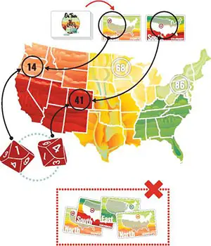 When writing numbers, players choose two of the three cards. The numbers must be written in one of the regions on the displayed cards (North, Central..).. If you write a number on the same state displayed on the card, circle it.