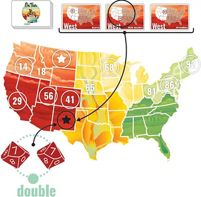 If all three cards display the same region OR if doubles are rolled, each player draws one star in any one empty state on their board instead of writing numbers.