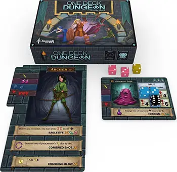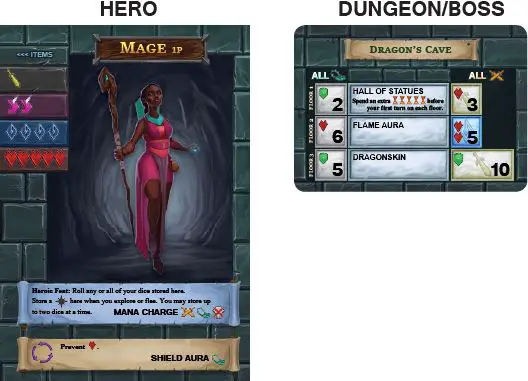 Each player chooses a hero card, and together your party chooses a dungeon to face. Multiplayer games are fully cooperative. Use the IP side of hero and level cards if playing solo, use the 2P side if playing with two or four players.