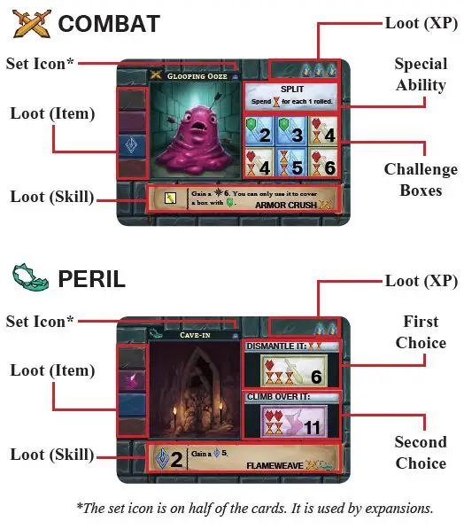 Each card in the encounter deck shows something standing between you and conquering the dungeon. In addition to the center of the card showing the obstacle the party must overcome, the edges of the card display the loot you'll claim if you survive. Encounters come in two types: combats and perils.
