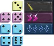 The dice, along with the tokens for potions form the general supply. There are 8 each of strength, agility, and magic dice, 6 heroic dice, and 6 potion tokens.