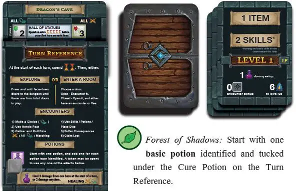 Forest of Shadows: in addition to a different set of heroes, encounters, bosses, dungeons, turn reference, and campaign sheets, also contains: