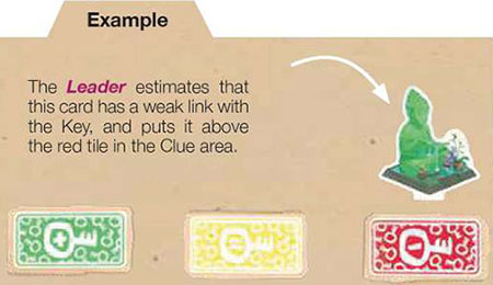 The Leader evaluates a card by gauging (from their perspective) the strength of its link to the Key. They then choose a Clue token of the color which best matches the strength of the link between, the card and the Key.