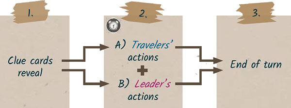 While the Leader prepares the Clue cards for the next turn during their action step, the Travelers try to deduce information on the Key.
