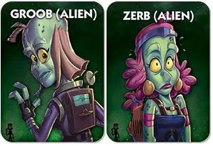 Each player receives one card (face down, which they look at secretly). While you may use any number of Aliens, we recommend using a combination of two Aliens (any two regular Aliens, Groob, or Zerb) for the best results.