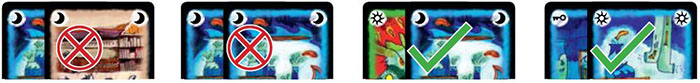 Example: the player draws 5 cards: 3 Location cards, 1 Dream card, and 1 Door card. He sets aside the Dream and the Door cards into the Limbo pile, and draws 2 replacement cards: 1 Location card and another Door card.