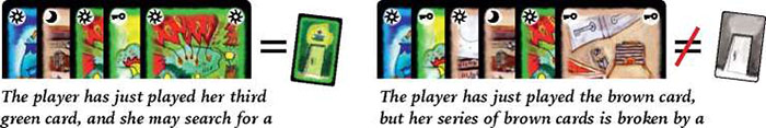 If the card just played is the third in a row of the same color, you obtain a Door card of that color: you may search this card in the deck, then place it on the table in front of you, and shuffle the deck.