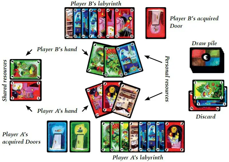 Various ways of playing the cooperative game are possible, from total silence (the players do not trade any information about the cards in their Personal resources and have to guess the best play possible according to the other player's actions) to open play (the players place their Personal resources face up on the table and discuss strategies openly).
