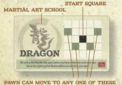 On your turn, examine and choose one of the two Move cards in front of you. Then, move one of your pawns'(student or master) as shown on that card. (The square grid will show you the way).