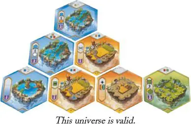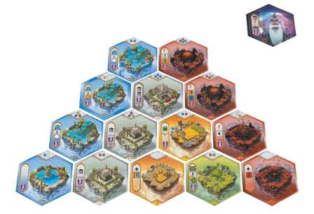 Each player will create their own universe. This universe takes the form of a 14-tile pyramid: a first row of 5 tiles, a second row of 4 tiles, a third row of 3 tiles, and a fourth row of 2 tiles.