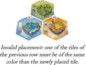 The first row of the pyramid (the 5 bottom tiles) is made up of tiles of any color. All first-row tiles must connect on at least one side.