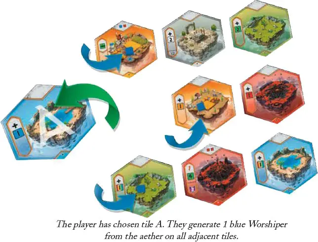 The player places one Worshiper from the aether that is of the same color as the chosen tile on each adjacent tile (orthogonally, never diagonally).