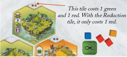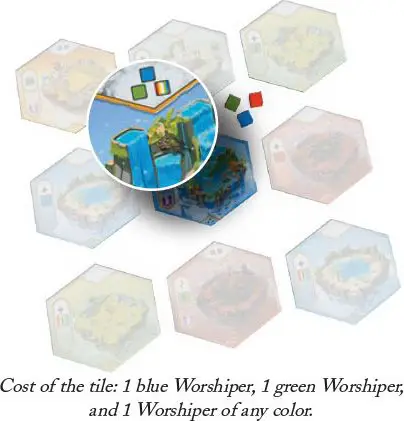 Discard the number of indicated Worshipers (their color is of no importance) from your realm to validate this tile (it will make you gain CPs at the end of the game). If you cannot or do not want to, hide the CP value shown on this tile with a Cancelation token.