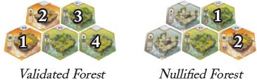 If you are among the players who have the most validated Forest tiles at the end of the game, gain 3 CPs.