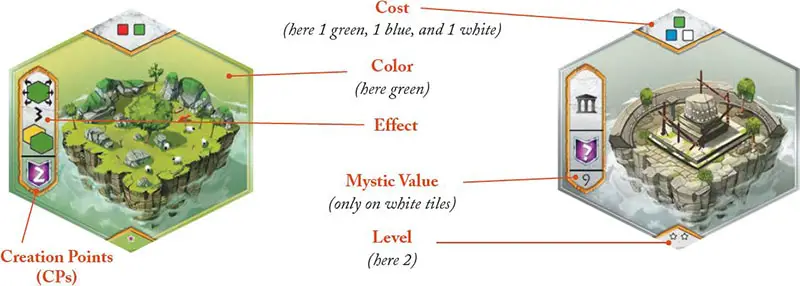 Destroy the indicated number of Worshipers (while complying with their colors) among those placed on the 8 remain- ing tiles in the center of the table to validate this tile (it will make you gain CPs at the end of the game).