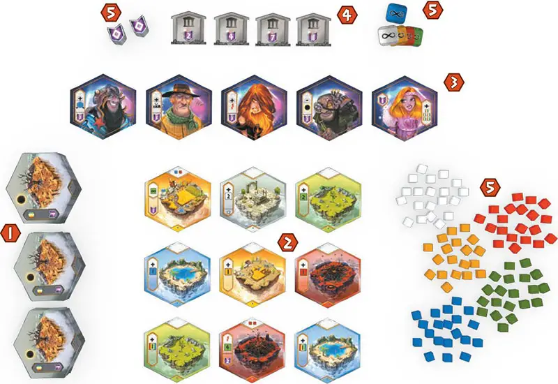 On their turn, a player must take a tile either among the 9 Region tiles in the center of the table or among the available God tiles (once during the game).