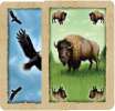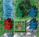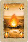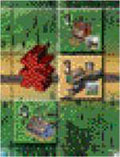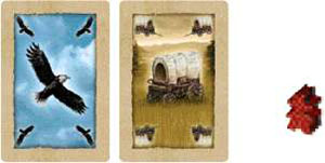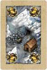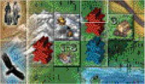 Thus, the player may place the building tile on any space in the row or any space in the column that has the same picture as shown on the landscape card he played with the building card. The building card played indicates which building he plays.
