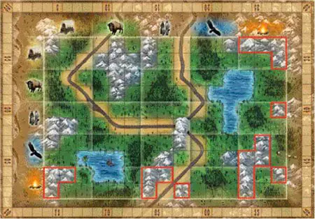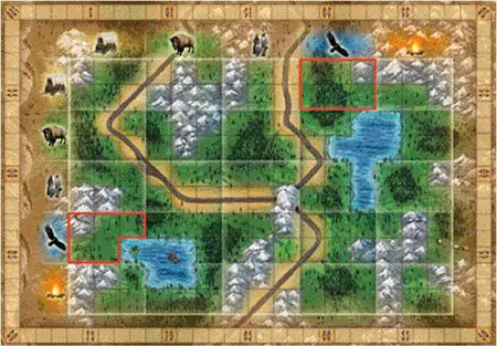 The red player must place a gold mine on one of the mountain spaces in the campfire row or column. The possible spaces are outlined in red.
