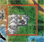 The red player must place one of his farmers on one the the 11 spaces outlined in red. He may not place the farmer on a space occupied by a building, another farmer, or on a water space.