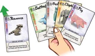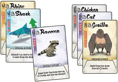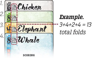 Example: From the Draw Line above, you could take the Bee, or the Parrot and the Raccoon. If you wish, you can also take less than 4 folds, such as the Chick and the Parrot. Folds you don't take are simply lost.
