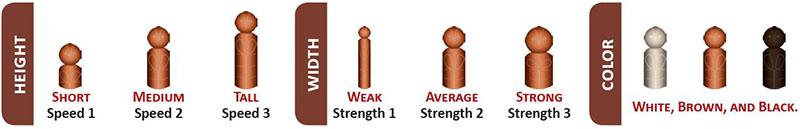 Each Pawn has three characteristics: his Speed (= height), his Strength (= width), and his Color. Each characteristic comes in three different variants.
