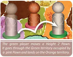 The player can move one of his Pawns (with its Village), already placed on the Main Board, up to a number of territories corresponding to his Height (1, 2 or 3). During his movement, a player can move through territories, even if they are occupied by other players' Pawns.