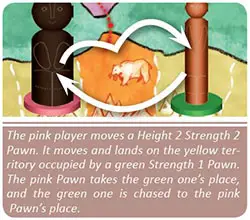 The arriving Pawn triggers a Trade: both Pawns (and their Villages) switch places. The stronger Pawn takes over the weaker Pawn's territory, and the weaker Pawn is sent to the territory the stronger Pawn just left.