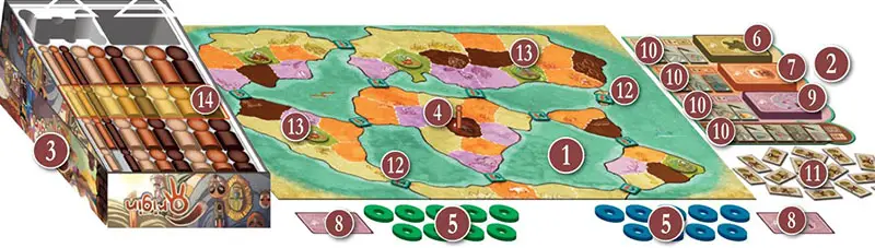 Then place one of the shortest and weakest Pawns of any color on the territory marked by the Origin symbol 4. Each player chooses a player color (not a Pawn Color) and takes the 9 corresponding Villages 5.