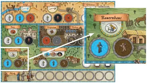 Place the required Character Tiles on the corresponding Action Spaces of the Place you want to activate. A Place is considered activated as soon as all of its Action Spaces have a tile. You can carry out the action during the following or during a future Action Phase.