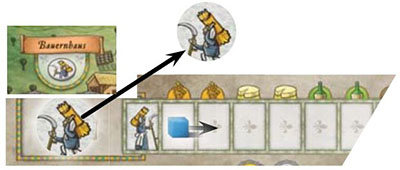 Then advance your marker one space on the Farmers Track and receive the depicted good. The position of your marker on this track also plays a role during Phase 2: "Census".