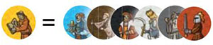 Sort the neutral Character Tiles (without the marking in player color) by profession and place them on the appropriate buildings on the game board.
