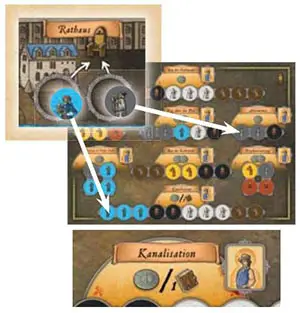 When using the "Town Hall" action, move one or both Character Tiles from the Town Hall to any free appropriate spaces on the "Beneficial Deeds" board. You receive the depicted reward (1, 2, or 3 coins, and in case of Canalization 1 coin or 1 Development Point) for each character.