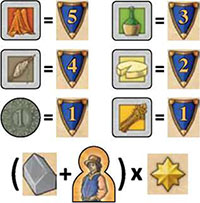 (Example: Klemens has built 5 Trading Stations and collected 2 Citizen Tiles. His current Development Status is 4, as indicated by the Development Track. He receives (5+2) x 4 = 28 VP).