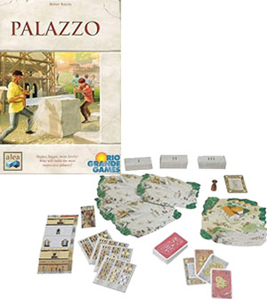 The players take on the roles of master builders and try to build the most valuable palaces. Each turn, a player has three possibilities: he can get more money from investors, he can buy or auction building materials, or he can spend his turn reconstructing his palaces, adding to their value.