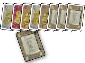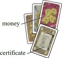show three different currencies, recognizable by the different coins and different colored backgrounds on the cards. Each currency has three cards each with values 3, 4, 5, 6, and 7. In addition, there are 10 certificates of value 2, which are currency neutral and can be used as jokers with the value of 2 with any of the three currencies.