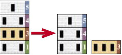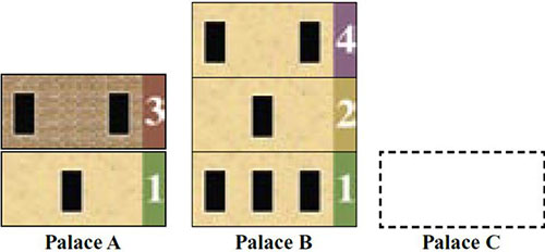 1on top of Palace A as doing so goes against building rule 1: 1,3,2 is not allowed). She also cannot insert the tile into Palace A between floors 1 and 3 directly. First, she can use building tile1to begin a separate palace (in this case, Palace C). Then, on a later turn, she can use "tile reconstruction" to insert the tile in Palace A.