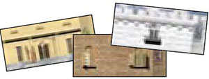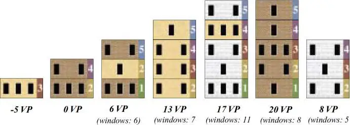 They represent three different types of materials (brick, sandstone, marble) and have one to three windows or doors each. Attention: later in these rules, windows refers to both windows and doors.