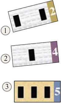 There are building tiles for five different floors (numbered 1 to 5 on the right edge of each tile), from ground floor (= 1) to the roof (= 5). With these building tiles, the players build palaces, which earn them victory points at game end. The more windows a palace has, the more points it earns.