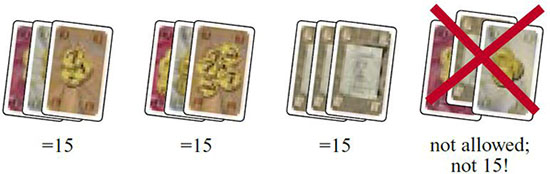 Exception: exactly 3 cards of the same value and in all three different currencies, or exactly three value 2 certificate cards, have the neutral payment value of 15 (regardless of the actual sum of the values of the three cards).
